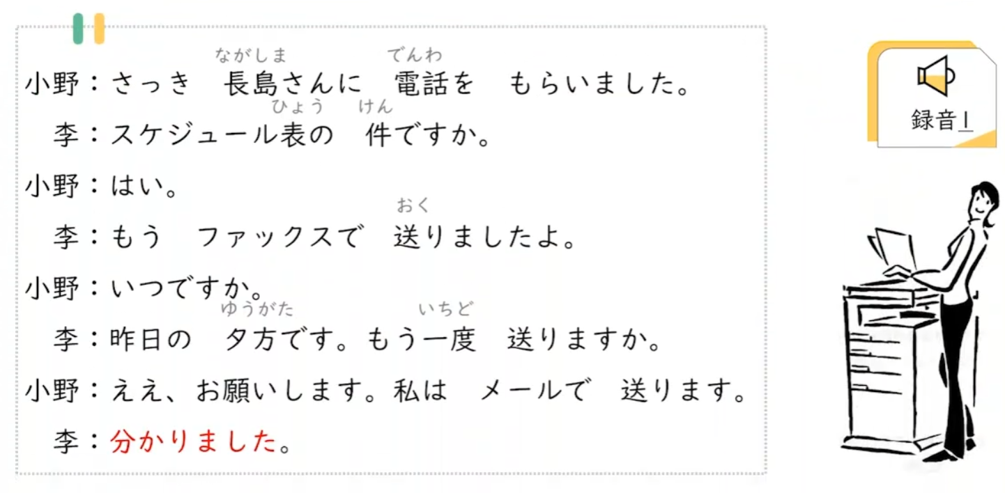 小李 11 月初计划和摄影师长岛及小野一起去箱根采访,但小李给长岛发过去的日程表长岛好像没有收到。于是,他打来电话。