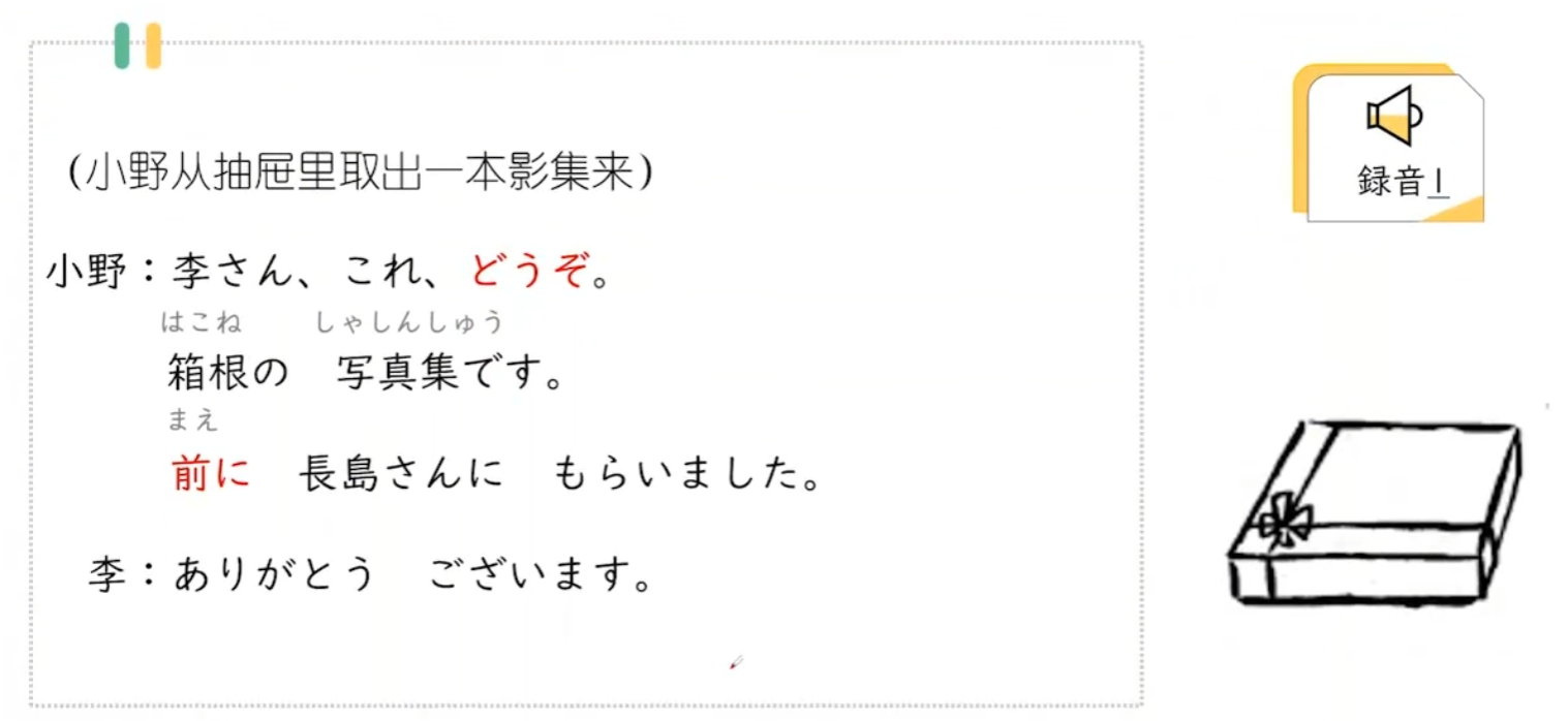 A:Bさん、その辞書、いいですね。 B:あ、ありがとうございます。先輩に もらいました。