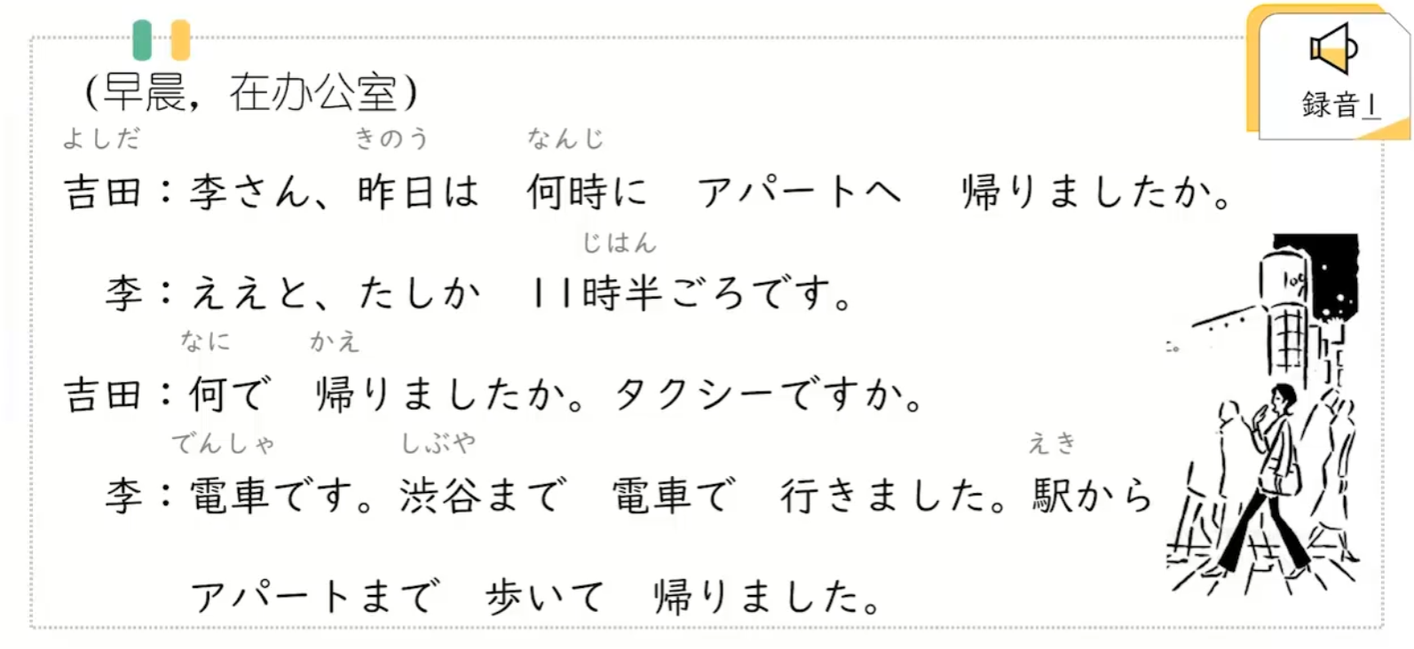 1 | 吉田:李さん、昨日は 何時に アパートへ 帰りましたか。 小李,你昨天几点回公寓? |
