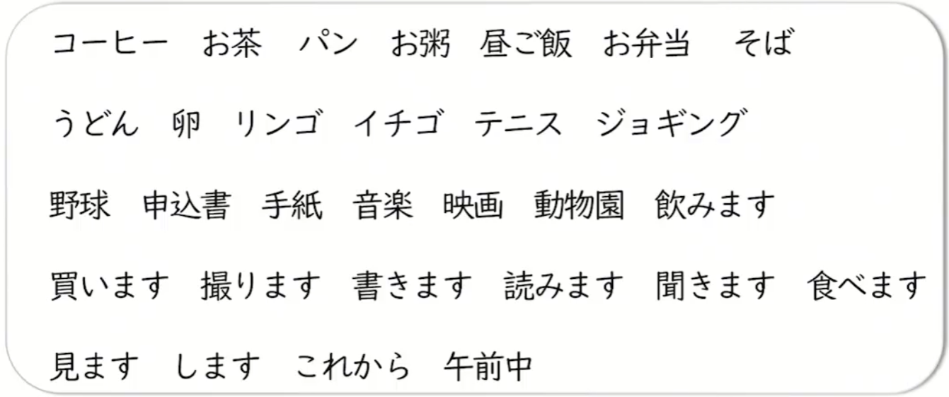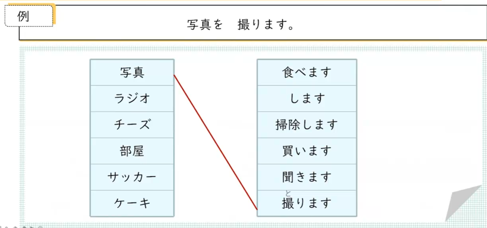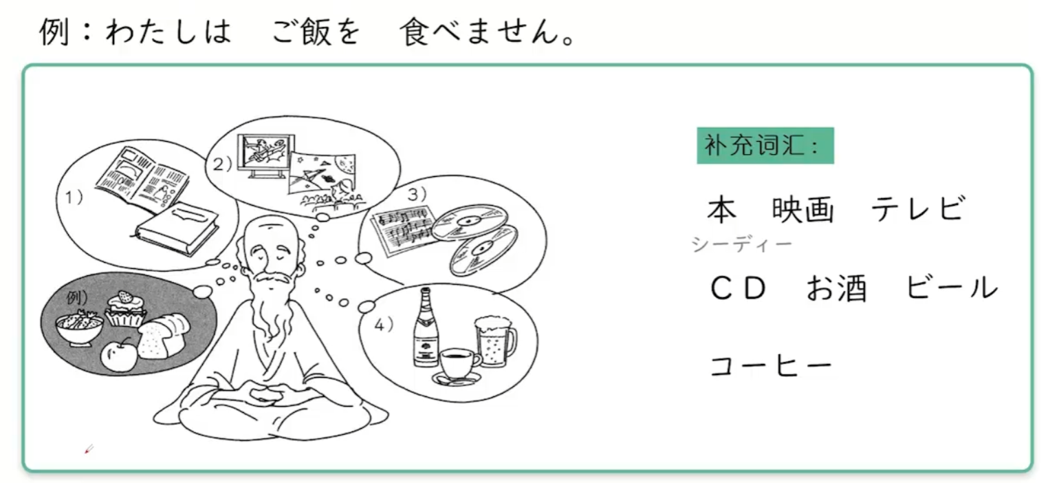 - 例如,食べます(吃) → 吃的对象可以是りんご(苹果),料理(菜)等。