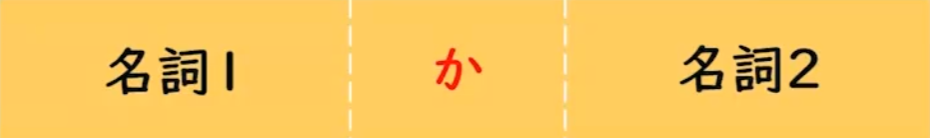 | 名詞 か 名詞 | 名詞 か 名詞 | 表示选择关系 / 或者,用于在多个选项中进行选择。 | パンかご飯を食べます。 (吃面包或者米饭。) |