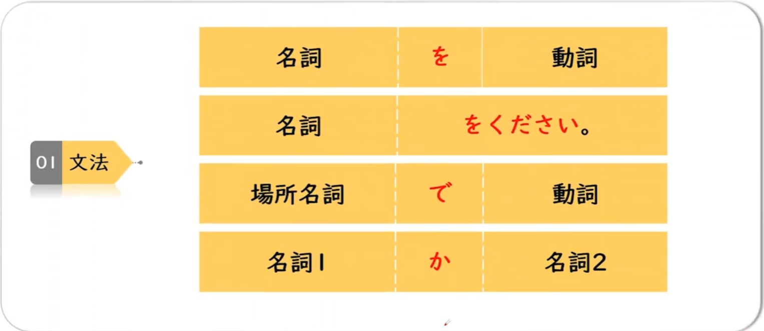 | 名詞 を ください | 名詞 を ください | 表示礼貌地请求某样东西,常用于点单、购买或索要物品。 | コーヒーをください。 (请给我一杯咖啡。) |
