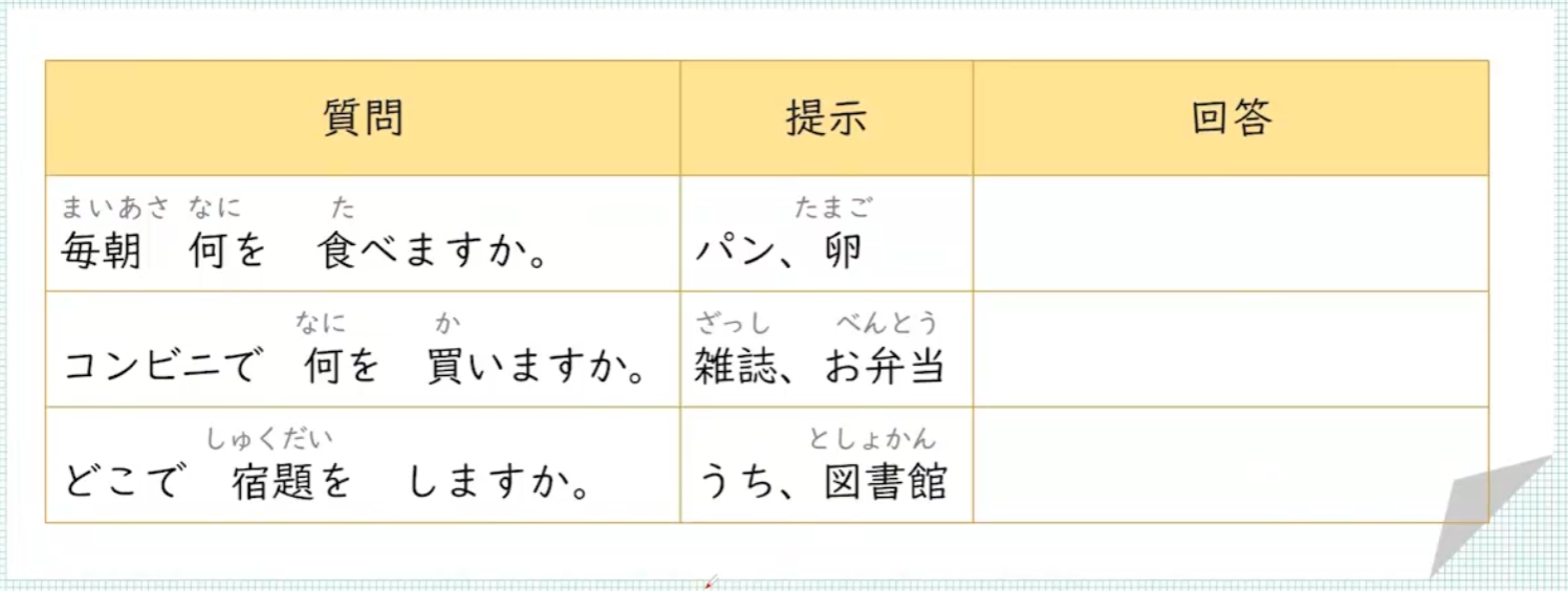 1 | 毎朝 何を 食べますか 毎朝 パンか卵を 食べます |