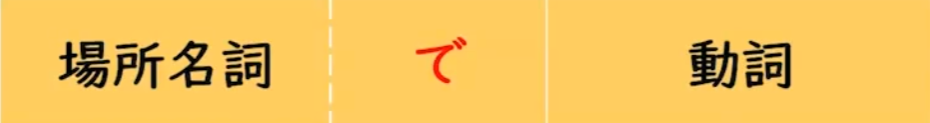 | 名詞[場所]で 動詞 | 名詞[場所]で 動詞 | 表示动作或事件发生的场所,强调“在哪里做事”。 | 学校で勉強します。 (在学校学习。) |