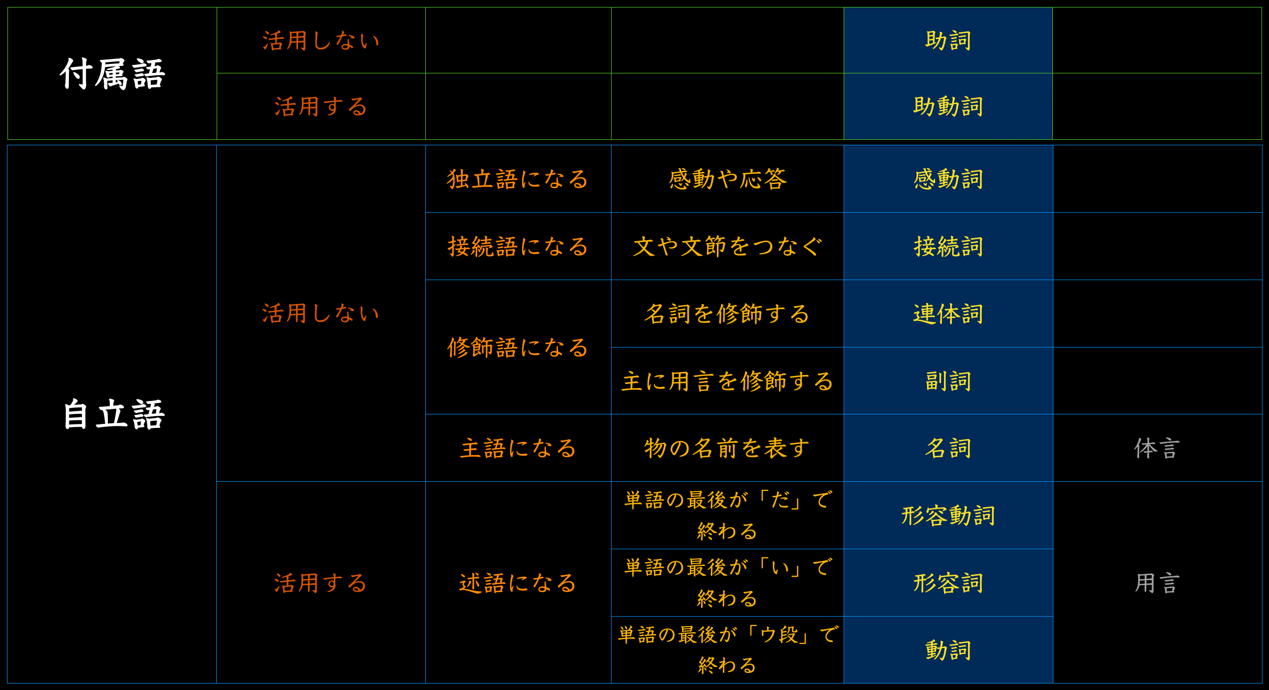 | 副词 | 副词是用来说明“怎么做”“做到什么程度”的词。它不单独当句子主角,而是帮动词或形容词把意思说清楚。 | 用来“怎么做 / 做到什么程度” | とても(非常) よく(经常) |