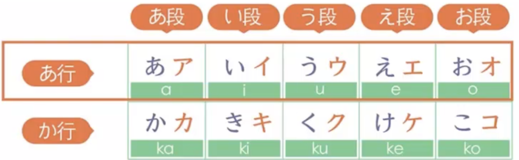 五十音图由五段十行构成:横向为「行」,纵向为「段」。每一个发音都对应平假名和片假名两种假名,二者读音相同,但在写法和用法上有所区别,其关系可类比为英语中的大小写字母。五十音图的第一行称为元音行,是最基础的发音来源,后续各行的发音均在这五个元音的口型基础上形成,因此罗马字拼写中也都包含相应的元音字母。元音是否发音准确,直接影响后续辅音的发音质量,是学习五十音时最重要的基础。