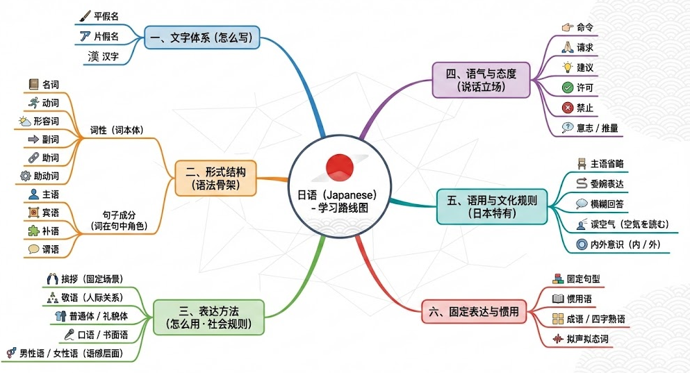 语序逻辑意思是一种语言“习惯先说什么,后说什么”的思维顺序。日语采用 SOV 语序结构 主语(S 谁 / 什么)+宾语(O 做什么 / 对谁做)+动词(V 动作(做什么)),句子以动词为中心,所有信息围绕动词展开,日语基本倾向是把谓语(动词/形容词/名词+です)放在句末。