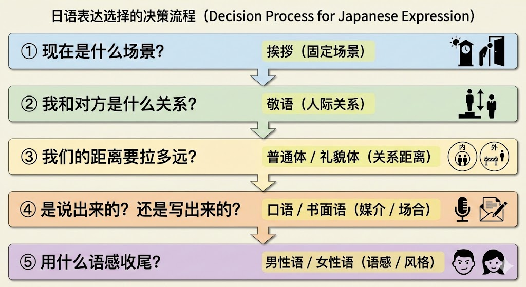 是人际关系得以成立的前提。如果缺少这一步,后续的交流往往无法顺利展开。挨拶并不是“想怎么说就怎么说”的自由表达,而是一种在特定场景中必须启动的固定表达。它所关注的并不是语法是否正确,而是:“在我此刻所处的场景中,哪一句话才是唯一合适的关系启动语?”正因如此,挨拶具有高度程式化的特点——在特定的时间、特定的地点,说特定的一句话,不需要思考造句,只需要正确触发。从本质上看,挨拶是一种