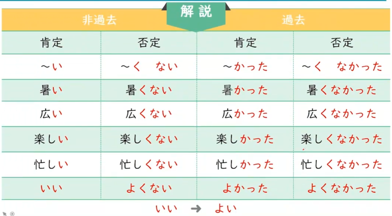 | イ形容詞(现在)→ 形容词的现在时态 イ形容詞(否定)+ くない → 形容词的否定时态 イ形容詞(过去)+ かった → 形容词的过去时态 イ形容詞(过去否定)+ くなかった → 形容词的过去否定时态