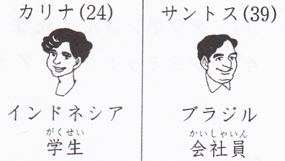 - 你好。我是サントス。三十九岁。IMC的职员。巴西人。这位是我的朋友。他不是巴西人。他是印度尼西亚人。富士大学的学生。请多多关照