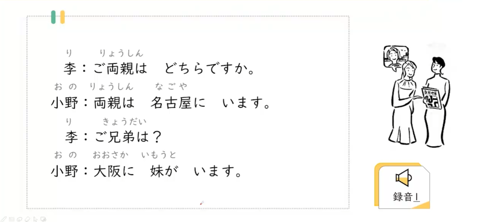 - ご両親は 日本(にほん)に いらっしゃいますか。→ 您的父母在日本吗?