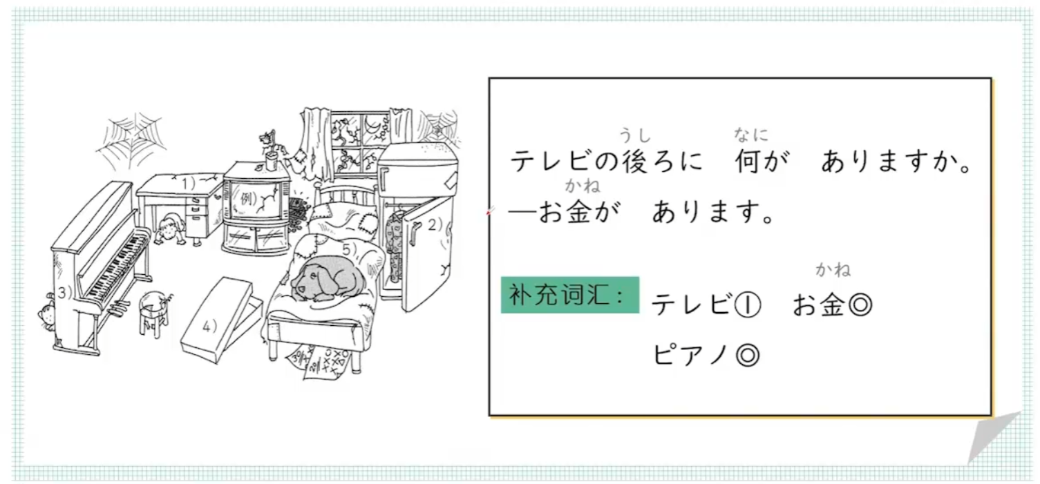| A:私の部屋は二階にありますよ。 我的房间在二楼哟。 B:そうですか。部屋に何がありますか。 这样啊。房间里有什么呢。 A:部屋に机があります。いすもあります。 房间里有桌子也有椅子。 B:部屋にテレビがありますか。 房间里有电视机吗。 A:はい、あります。 是,有的。 B:テレビはどこにありますか。 电视机在哪呢? A:テレビは机の上にあります。 电视机在桌子上。 B:そうですか。 原来是这样啊。