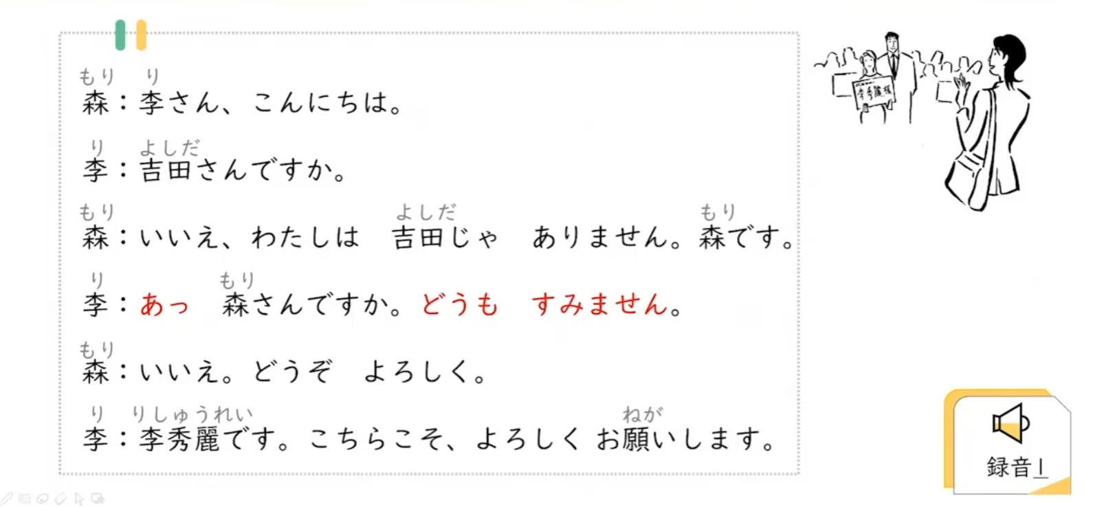 | ワン:初めまして、ワンです。よろしくお願いします。 初次见面、 我是小王。 请多多关照。