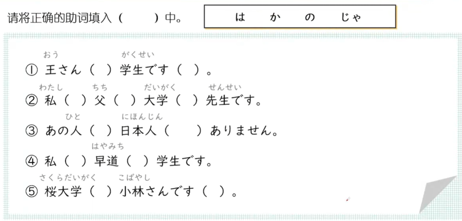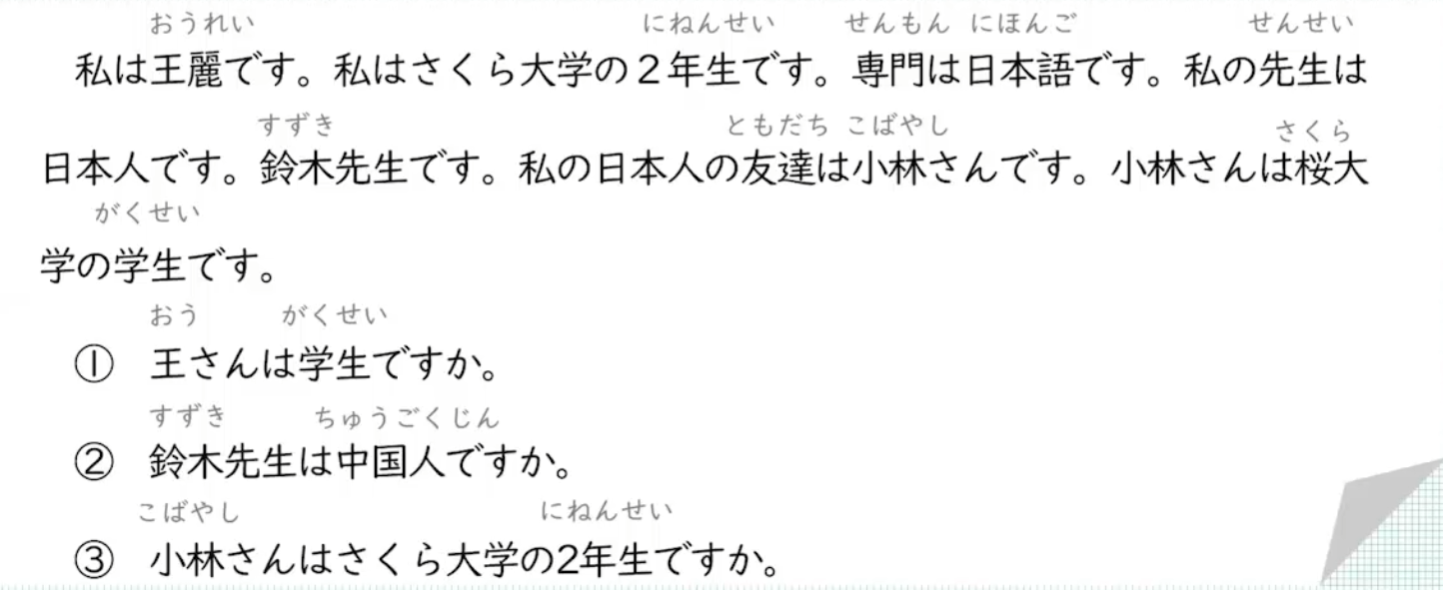 | 翻译:我是王丽。我是樱花大学的二年级学生。专业是日语。我的老师是日本人。铃木老师。我的日本人朋友是小林。小林也是樱花大学的学生。
