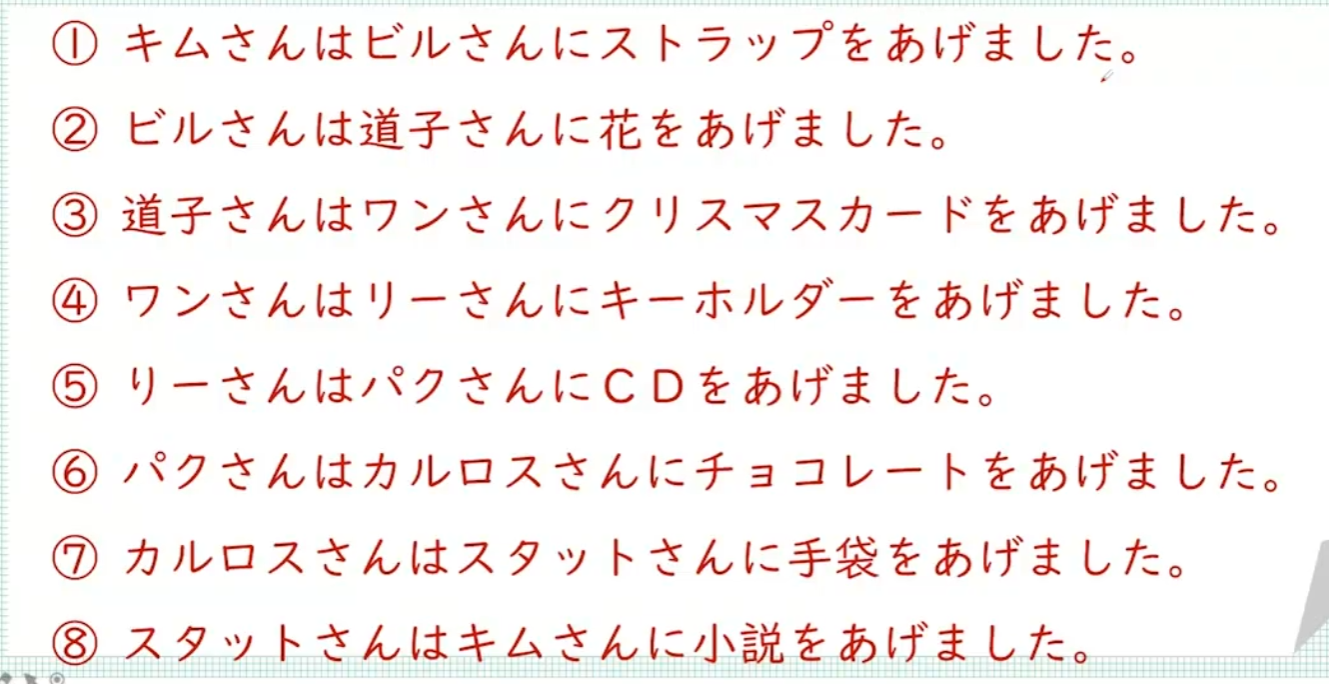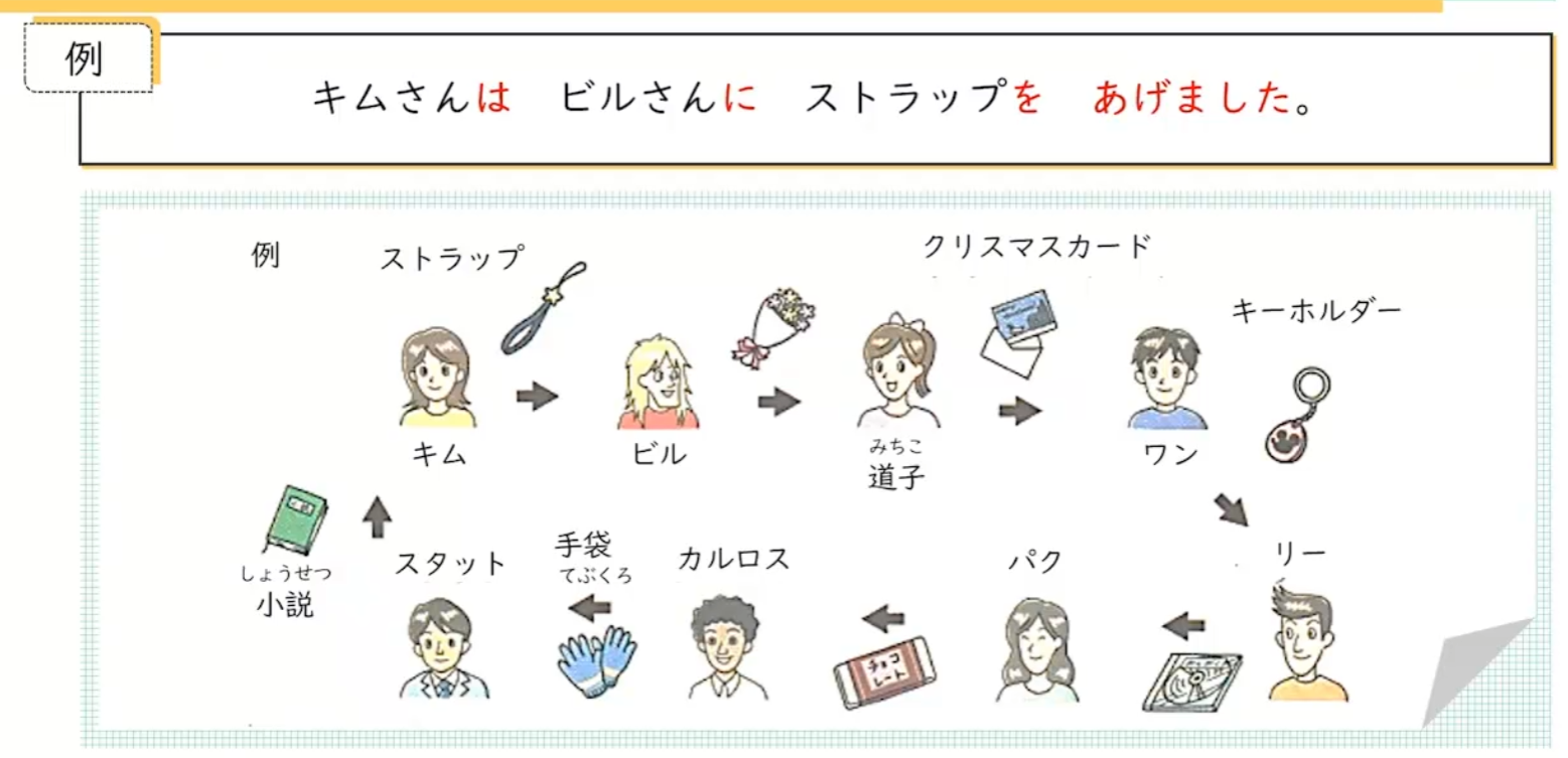 名[人]は 名[人]に(から) 名[物]を もらいます |