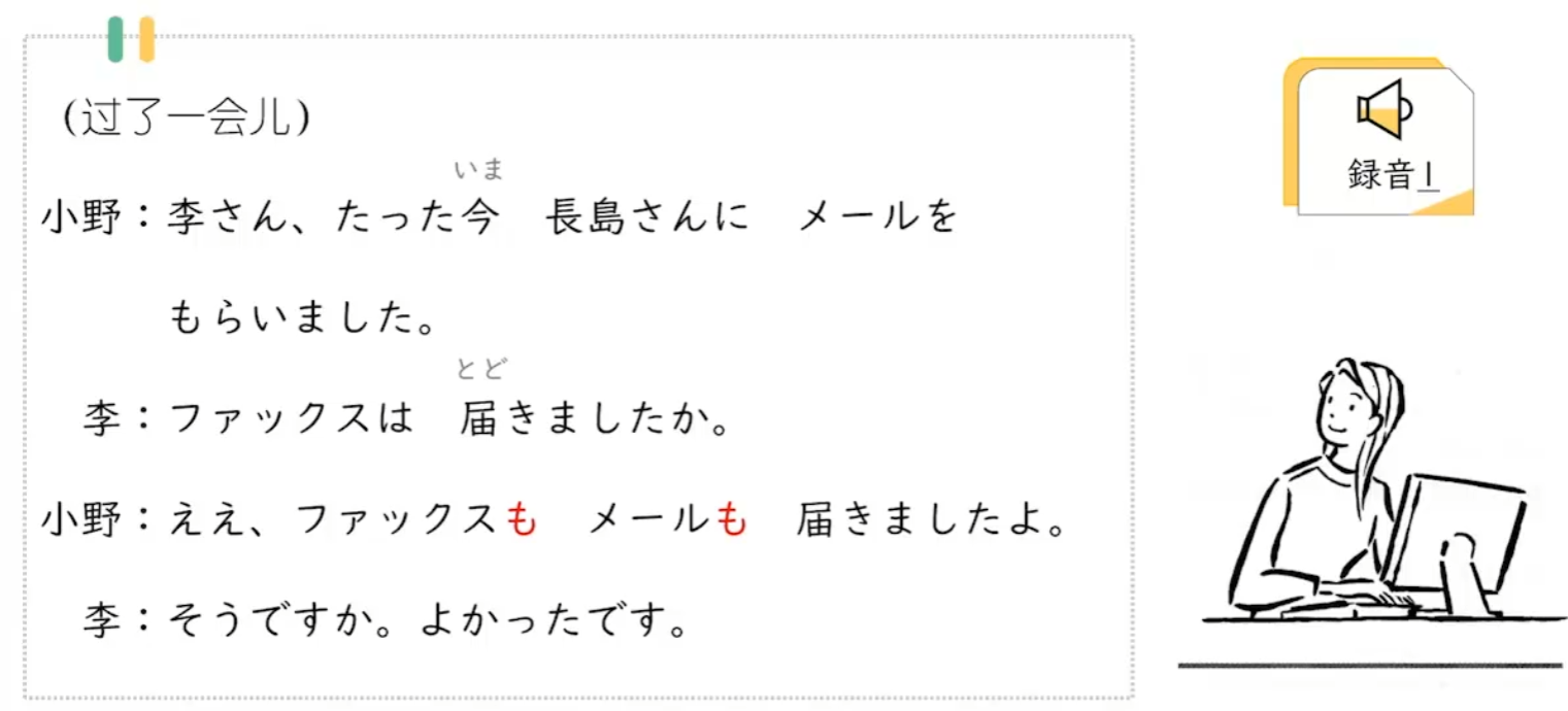 | も 不仅可以用一次表示也,也可以两次重叠出现,传真和邮件都到了。传真到了,邮件也到了。