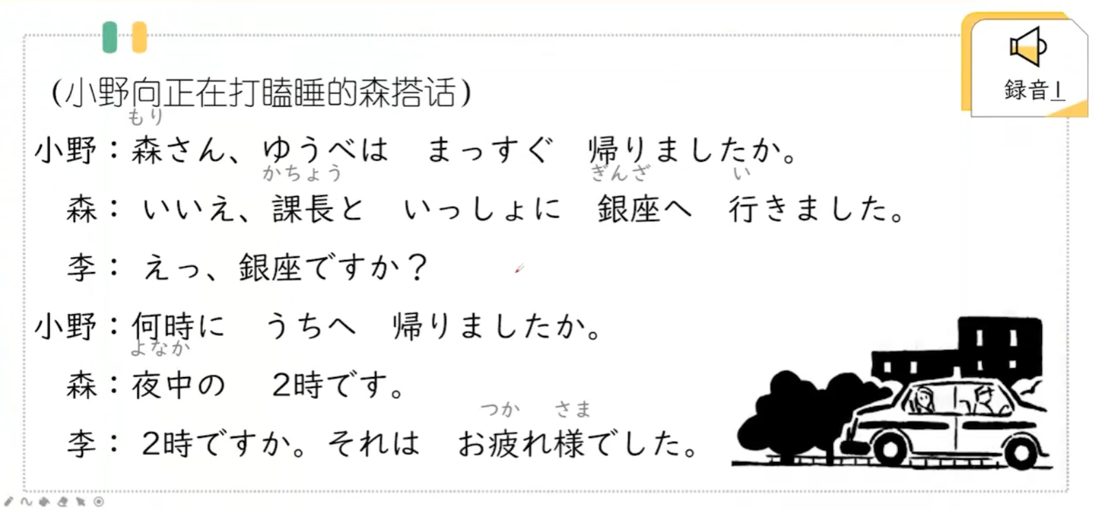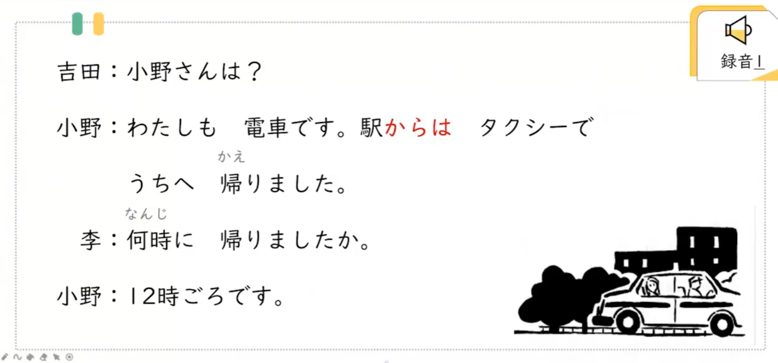 | 吉田:李さん、昨日は 何時に アパートへ 帰りましたか。 小李,你昨天几点回公寓? 时间点后加上に、疑问词 何時 + に 表示对时间的提问 アパートへ。 へ 接在场所 アパート 的后面表示移动的方向 帰りました。因为是询问昨天,所以回去使用过去式 ました