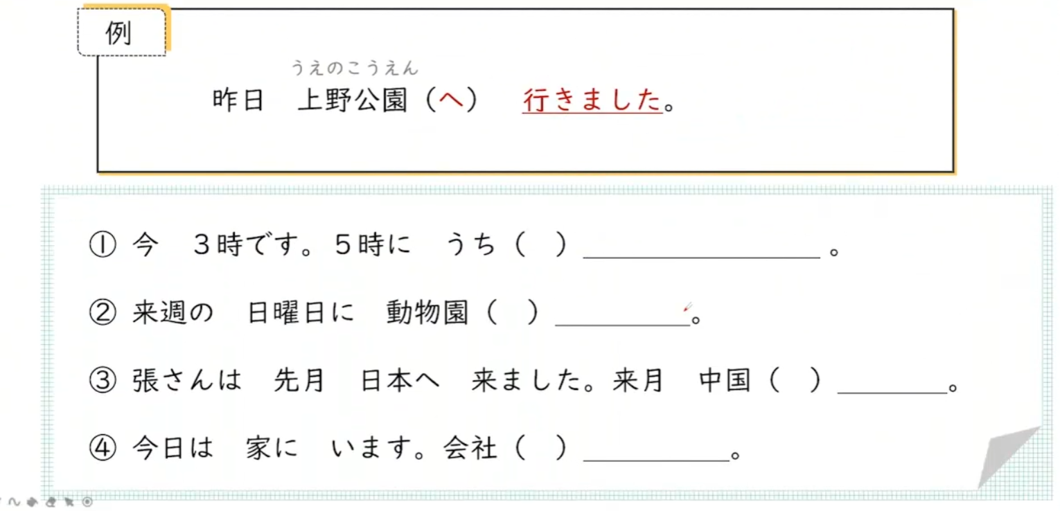 | ① 今 三時です。五時に 家 へ 帰りまし。 现在是三点五点回家。