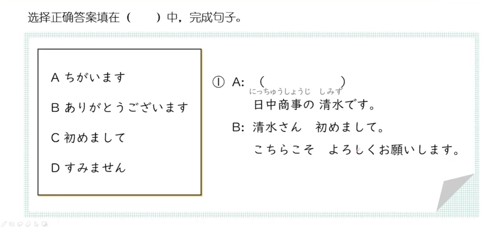 A ちがいます。 不是 B ありがとうございます。 谢谢 C 初めまして。 初次见面 D すみません。 对不起