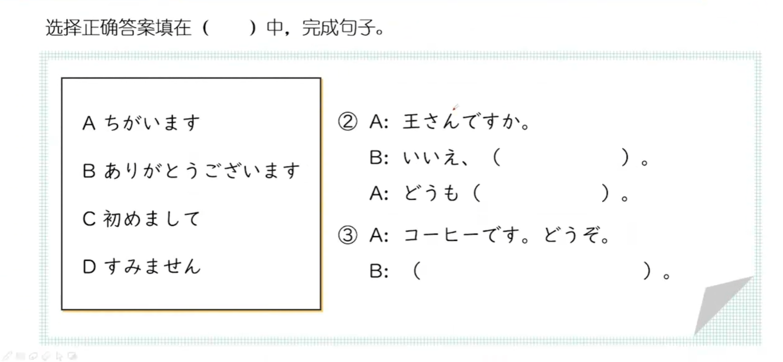 | A ちがいます。 不是 B ありがとうございます。 谢谢 C 初めまして。 初次见面 D すみません。 对不起
