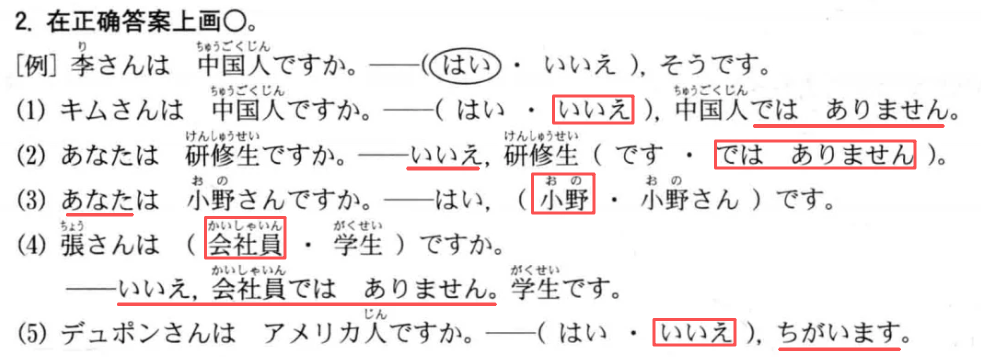 あなたは小野さんですか。 いいえ,小野ですありません。 小野さん 你是小野吗? 不是,我不是小野。
