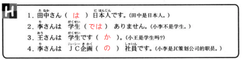 | 李:JC企画の小野さんですか。 (你)是JC企划的小野吗? の 在此处表示从属关系,JC企划公司的小野 此处省略了人称代词 あなたは,完整句式:(あなたは) JC企画の小野さんですか。 さん 表示礼貌