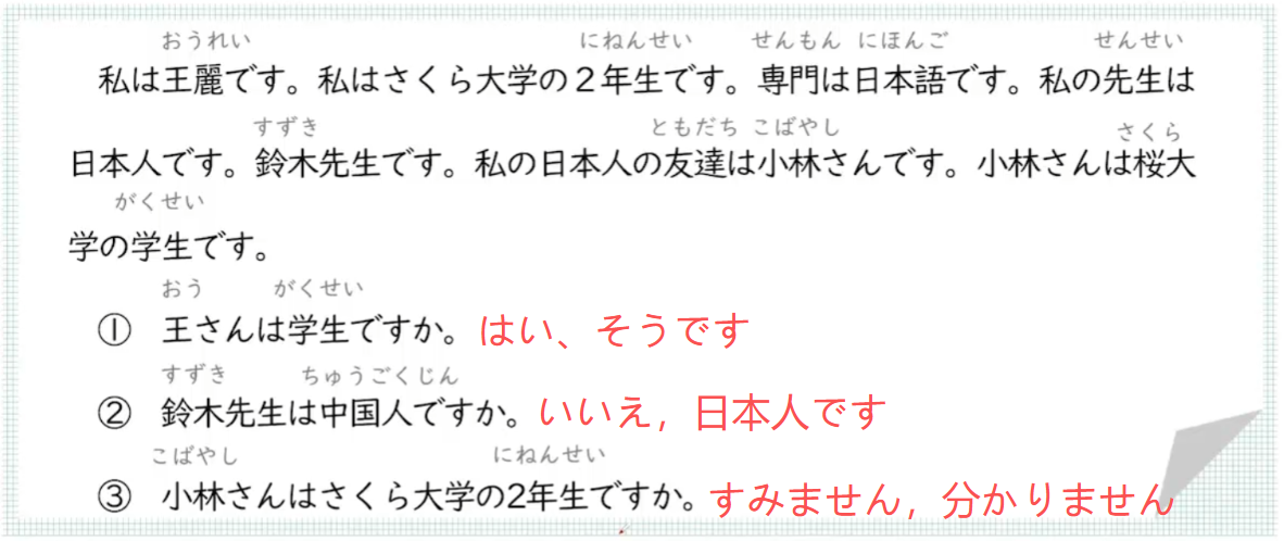 | 私は王麗です。私はさくら大学の2年生です。専門は日本語です。私の先生は日本人です。鈴木先生です。私の日本人の友達は小林さんです。小林さんは桜大学の学生です。