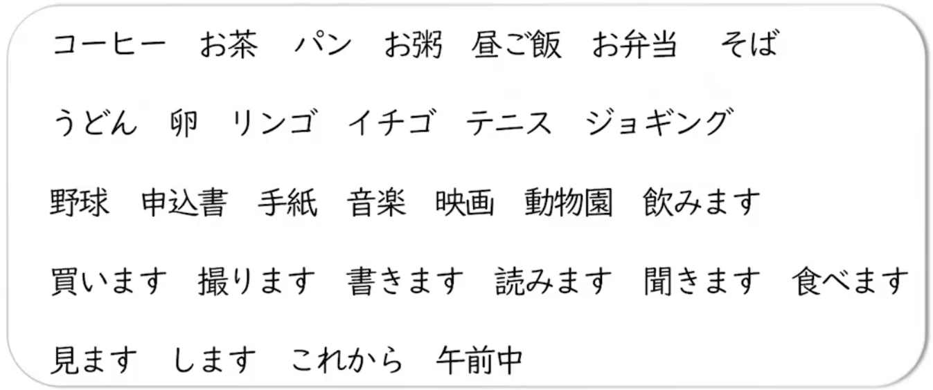 | 💬 句型结构 | 名词 + を + 动词。例:ごはんを食べます(吃饭)。 |