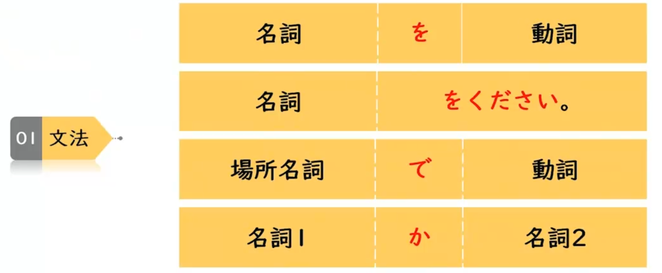 | 📰 名[物品]をください | 表示“买东西时的请求” | 新聞(しんぶん)をください。 | 请给我一份报纸。 |