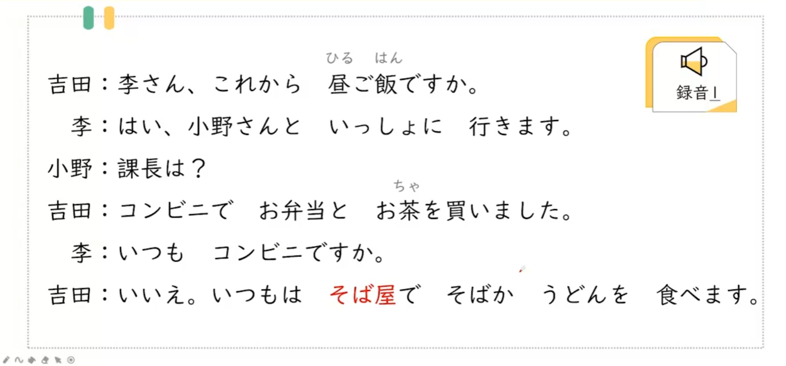 1 | 吉田:李さん、これから 昼ご飯ですか。 小李,接下来你是要去吃午饭吗? |